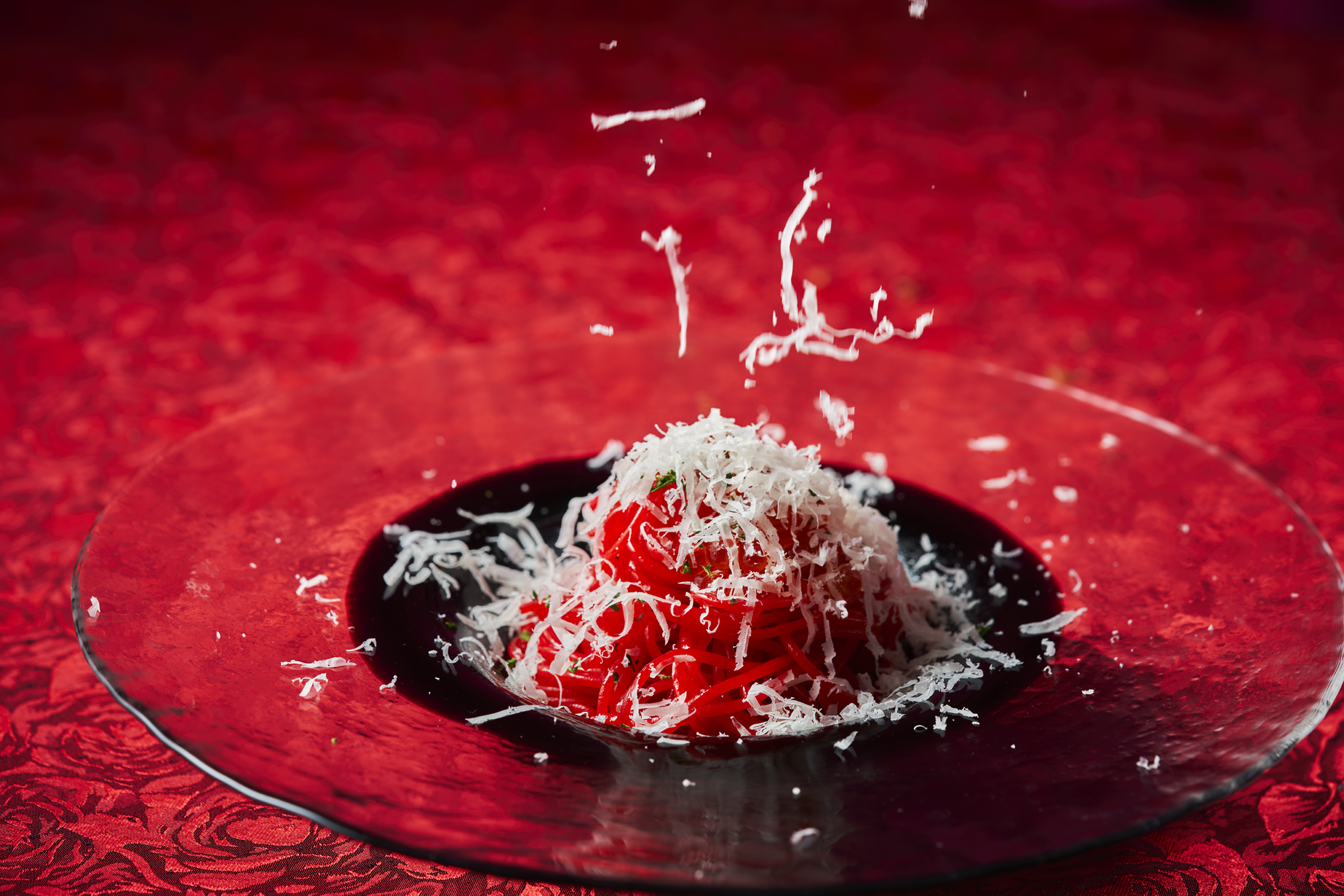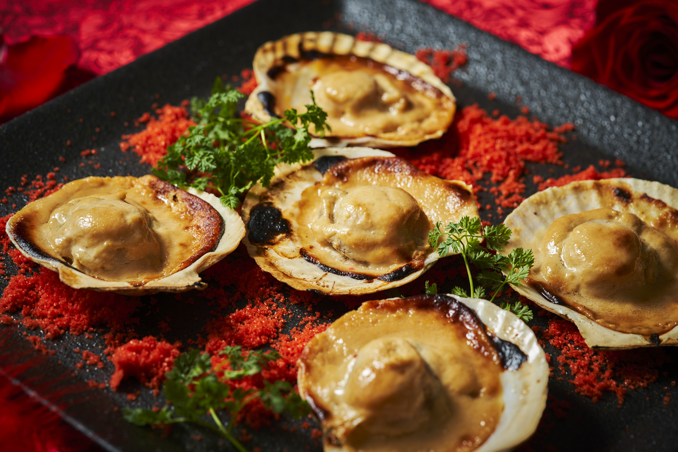 また、料理にも赤色を取り入れた「殻付き帆立貝柱のラプラージュ」や「出来立てパスタ いくらの醤油バターソース」等、世界各国の料理を赤いメニューにアレンジしたシェフこだわりのフュージョンキュイジーヌをご用意しております。スイーツ、ドリンクを含め約80種類の充実のラインアップ。