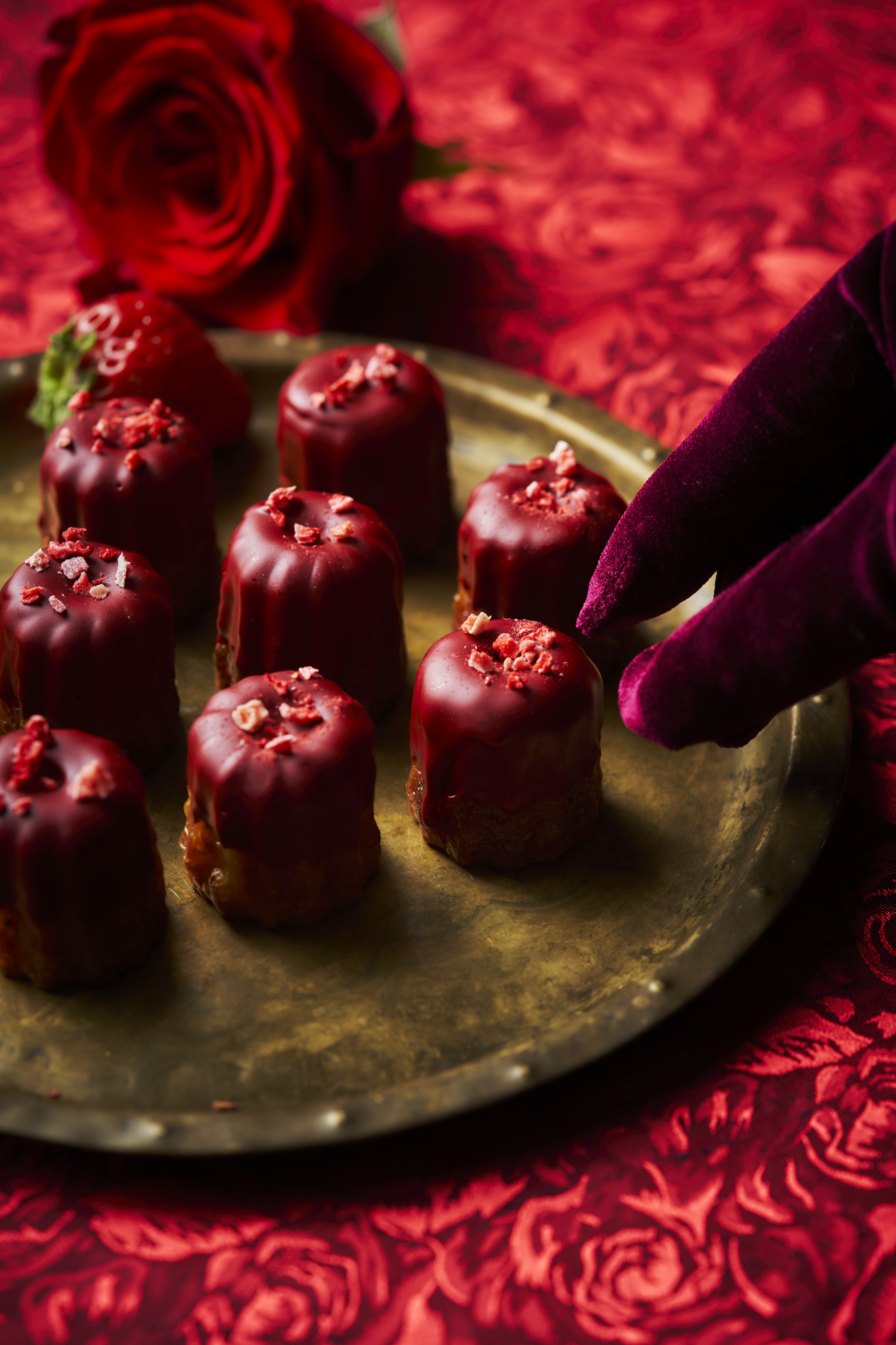 水晶を彷彿させるいちごゼリーと金箔のデコレーションが印象的で、いちごのスポンジケーキを包みこんだ赤いチョコレートのマット感が艶やかな雰囲気を醸し出す「THE RED tower」やレアチーズケーキを赤いミロワールでコーティングし、いちごと赤すぐりをトッピングした「Red mirror」、濃厚ないちごのチョコレートテリーヌ「Red carpet」をはじめ、モンブランやカップケーキ、マカロン、カヌレ、ムース等、13種のパティシエ特製オリジナルいちごスイーツをご用意いたしました。