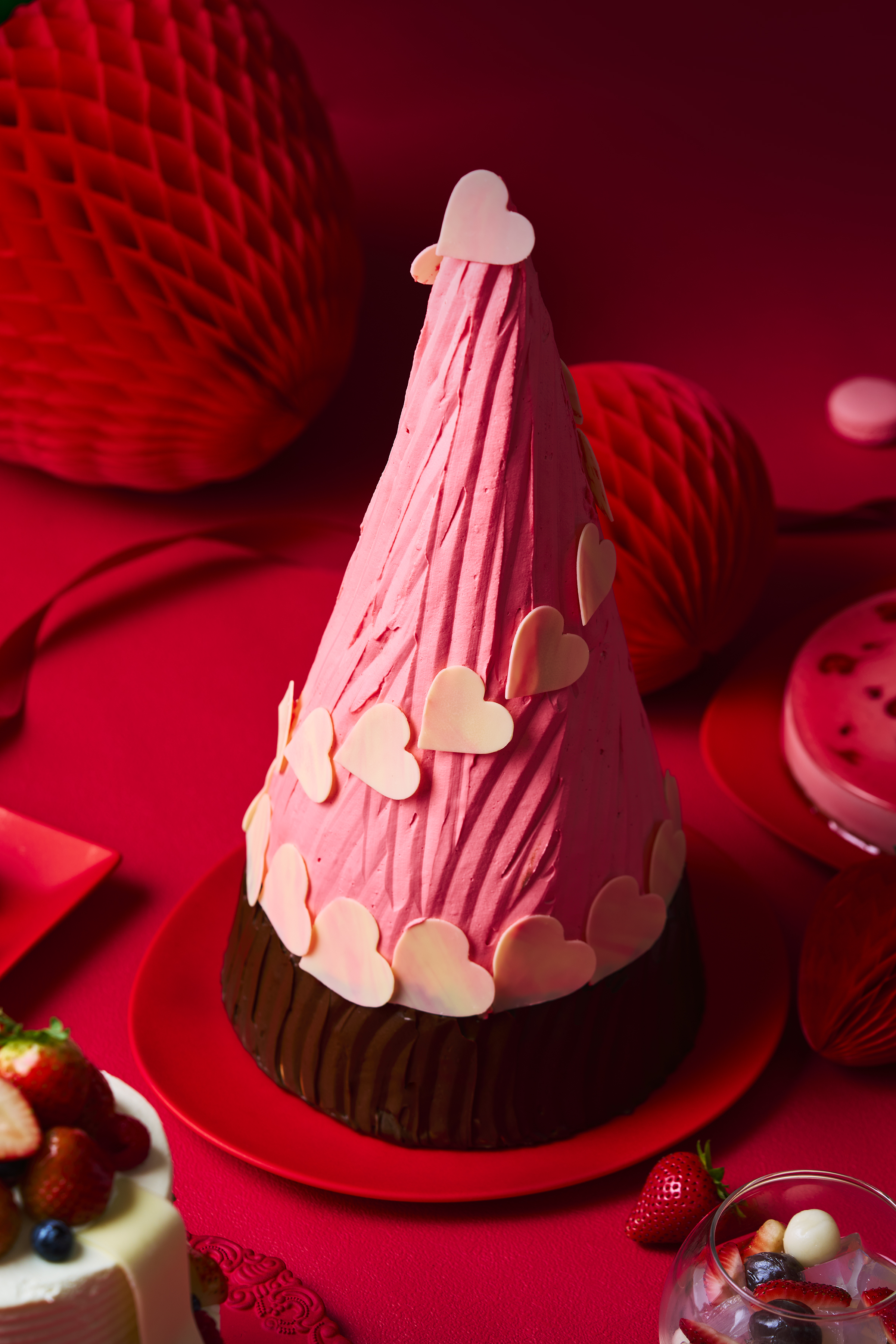 また、ゲスト参加型のイベント「あなたのBIG LOVE」も開催。ご来場いただいたゲストには、いちごをモチーフにしたメッセージカードを配布。「あなたのBIG LOVE」をカードに記し、中央にある回廊に設えたいちごのツタに巻き付けていただき、愛のメッセージでいっぱいになり、まるでいちご畑のように赤く彩られたフォトジェニックな空間へ。