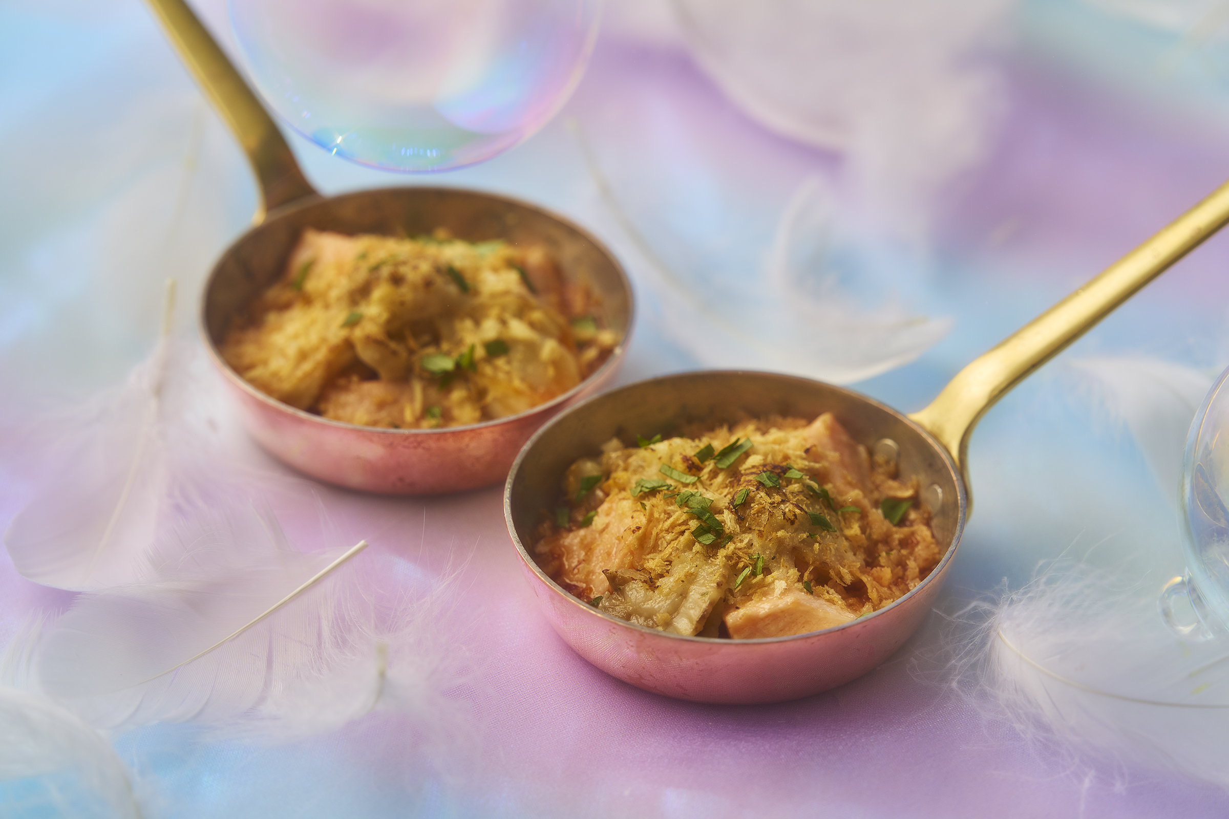 濃厚なチョコレートとバナナキャラメルを重ねた二段ケーキ『TIARA DELIGHT ―特別な日のチョコレートケーキ―』は、白い羽や星をまとって夜空に瞬く星座を思わせる1品。いちごクリームをまとったチーズケーキで三日月を、満月をかぼちゃクリームと洋梨で表現した『LUCENT ―ルナツインのベイクドチーズケーキ―』など、天使たちが星屑を集めて仕立てたかのようなスイーツがビュッフェラインを彩ります。